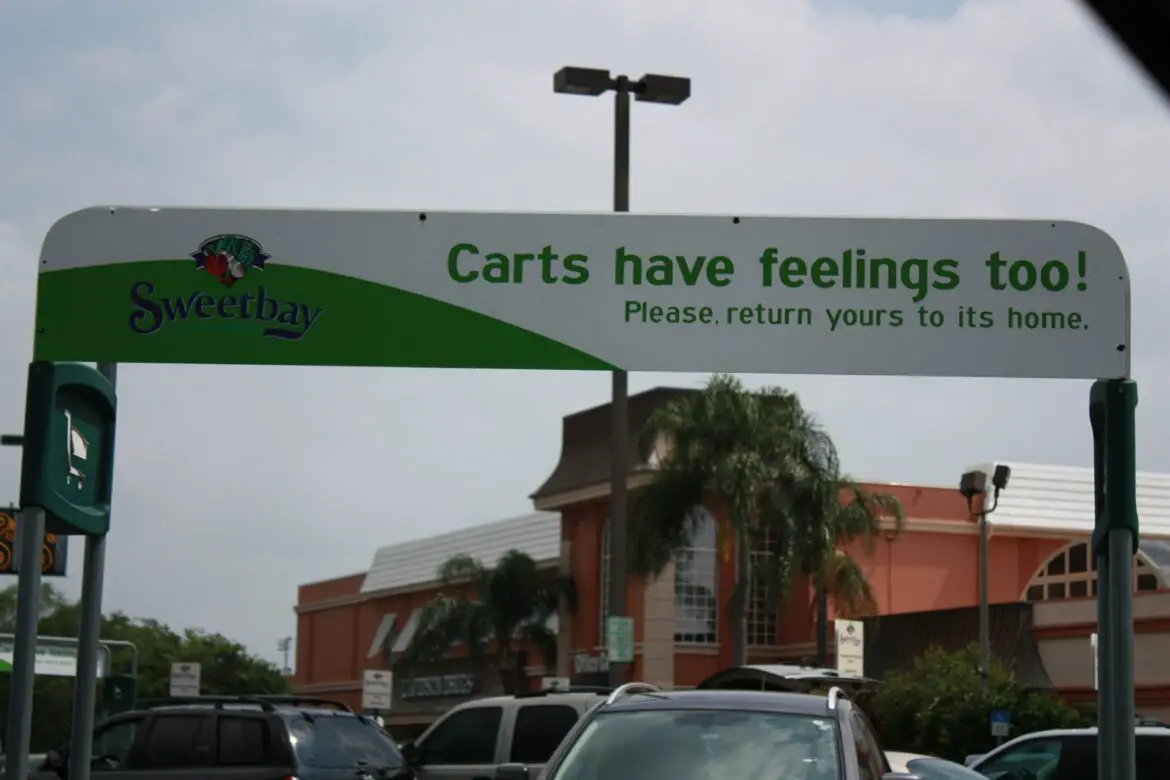 Ist das nicht niedlich? In Sarasota, Florida werden Kunden eines Supermarktes mit einem netten Hinweis im Eingangsbereich daran erinnert, die Einkaufswagen wieder zurückzubringen: „Auch Einkaufswagen haben Gefühle! Bringen Sie sie bitte zurück nach Hause“ heißt es da auf einem Schild im Eingangsbereich.