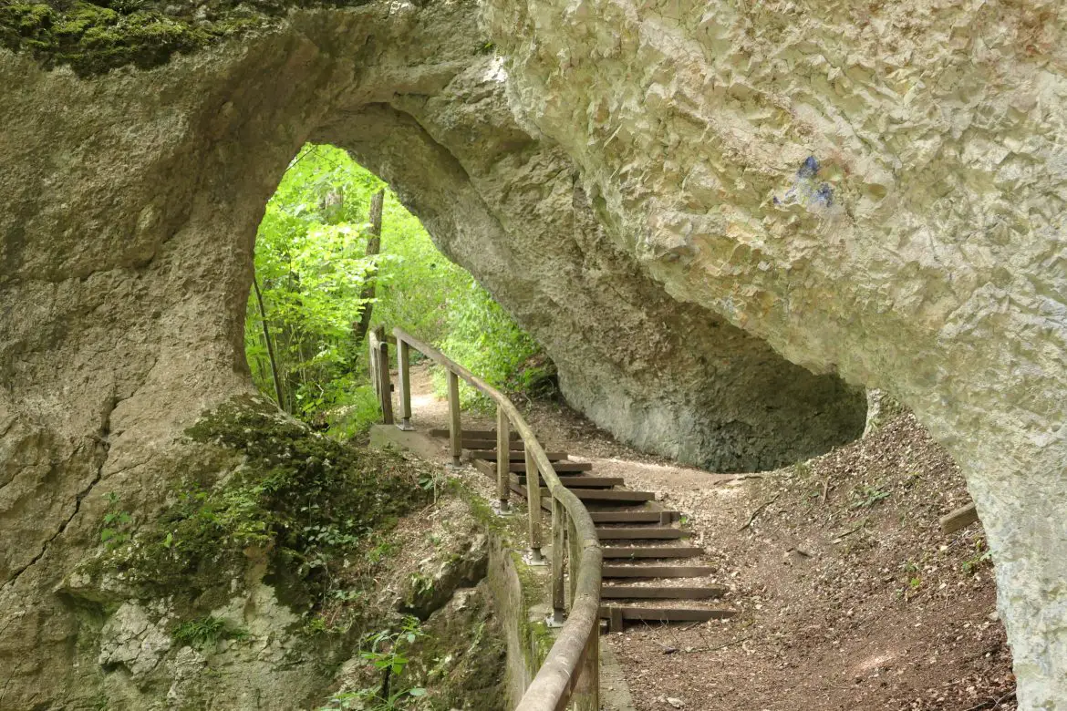 Ebenfalls auf der Bahnstrecke von Hechingen nach Sigmaringen liegt das Städtchen Veringenstadt. Auch hierher gelangt ihr günstig mit dem 9-Euro-Ticket. Schon allein wegen der wunderschönen Fachwerkhäuser und der Burgruine, die hoch über der Stadt thront, ist Veringenstadt einen Besuch wert. Noch dazu gibt es hier einen höchst außergewöhnlichen Wanderweg: den Höhlenrundweg. Etwa 40 Höhlen gibt es rund um Veringenstadt. Der Höhlenrundweg führt zu den fünf beeindruckenden Schauhöhlen. Einst lebten hier Neandertaler, aber auch Wollnashörner, Höhlenbären, Hyänen, Löwen und Mammute – die Wanderung rund um Veringenstadt ist auch eine Reise auf den Spuren der Vergangenheit. Anschließend solltet ihr aber unbedingt noch eine Runde durch Veringenstadt bummeln – leckere Kuchen und schwäbische Küche gibt es im Café Lauchertstüble. Wer übernachten möchte, findet dort auch gleich passende Gästezimmer.