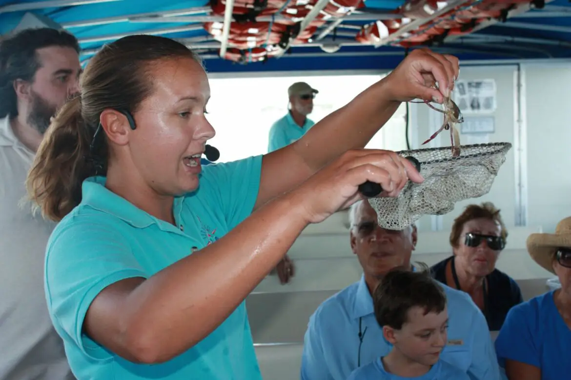 Mitten in der Sarasota Bay wurden schließlich die Netze ausgeworfen. Ein paar Minuten später, beim Einholen der Netze, dann große Spannung bei allen Gästen an Bord: Was haben wir wohl gefangen? Ein faszinierender Blick in die Unterwasserwelt Floridas. Die Biologin an Bord zeigt und erklärt jedes einzelne Fundstück, bevor sie es wieder zurück ins Meer wirft. Verschiedenste tropische Fische in allen Farben, Seesterne, Schwämme und sogar ein Seepferdchen. Die Kinder waren begeistert und tief beeindruckt zu sehen, was sich da so unter uns im Meer befindet.