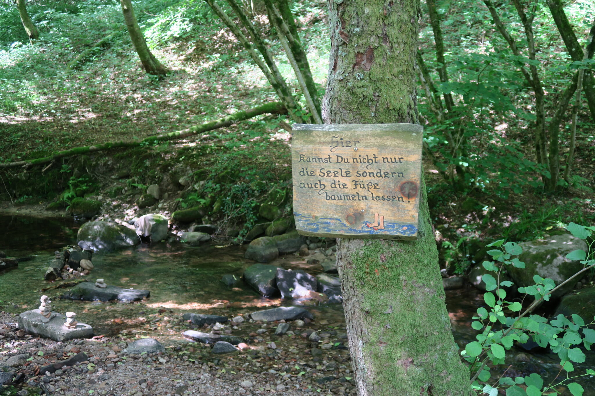 Wir ziehen die Schuhe aus und gehen barfuß weiter. Es ist ein ungewohntes und bewusstes gehen. Schritt für Schritt geht es voran, langsamer als vorher – aber auch aufmerksamer. Neben uns plätschert ein Bach, wir hören Vogelgezwitscher und das Rascheln der Blätter. Bald erreichen wir eine wunderbare Badestelle und kühlen unser Füße im eiskalten Bach.