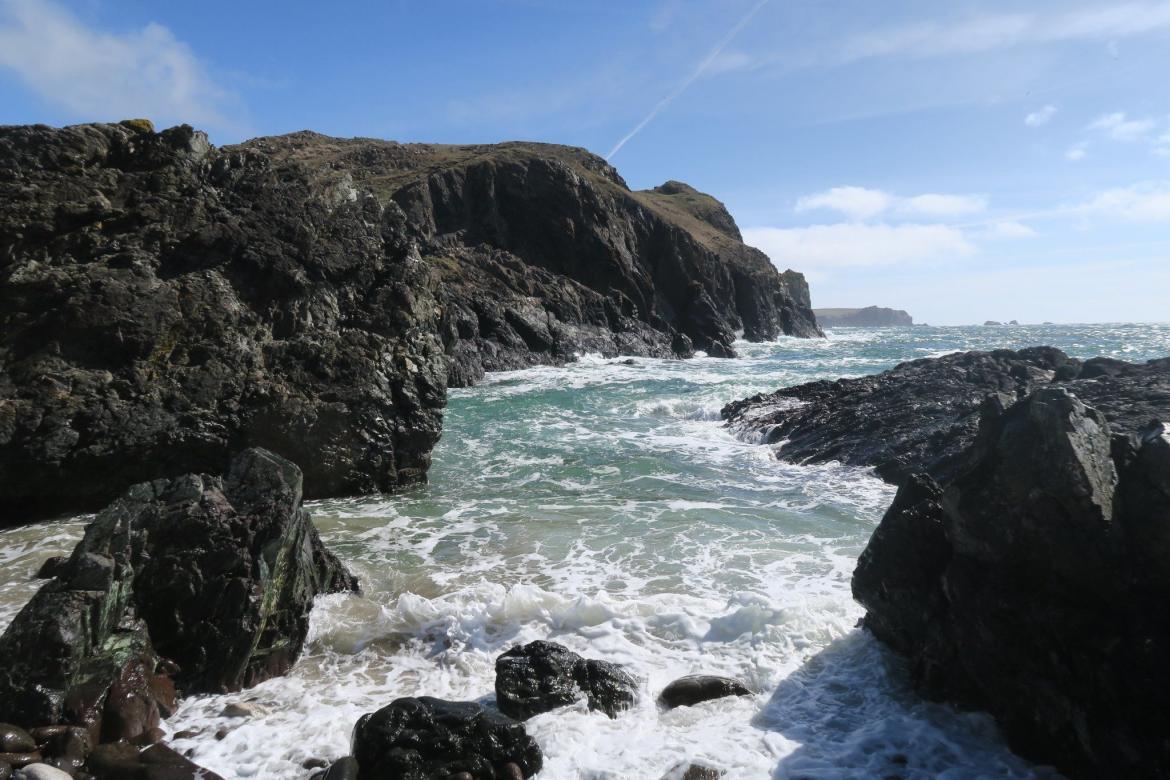 Am nächsten Morgen war es zwar bewölkt aber längst nicht so windig wie am Abend zuvor. Während wir frühstückten verzogen sich die Wolken und eine halbe Stunde später hatten wir strahlenden Sonnenschein. Wir beschlossen zu einer unserer Lieblingsbuchten, der Kynance Cove zu fahren. Der Parkplatz dort war noch fast leer und wir wanderten hinab zum Kynance Cove Café, das sich zwischen die hohen Klippen schmiegt. Dort war es fast windstill und dank des strahlenden Sonnenscheins erstaunlich warm. So saßen wir mit einem Clotted Cream Eis in der Hand da, ließen den Blick über die Bucht schweifen und genossen den Sonnenschein. Ein unglaublicher und vor allem unerwarteter Beginn unserer Urlaubswoche.